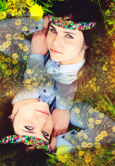 Woman double, girls twins, yellow field of dandelions